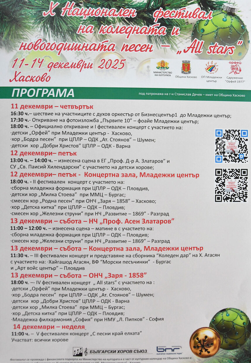 X НАЦИОНАЛЕН ФЕСТИВАЛ НА КОЛЕДНАТА И НОВОГОДИШНАТА ПЕСЕН – „All stars” от 11 – 14 декември 2025 Хасково