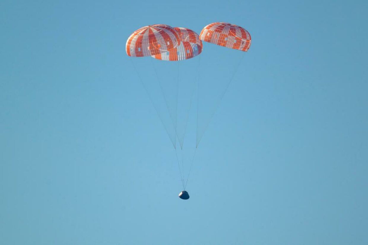 Напрежението спадна, когато връзката беше възстановена и от носа на свободно падащата капсула се видяха два парашута, които забавиха спускането ѝ до около 25 км/ч, преди "Орион" да се приводни плавно във водите на Тихия океан.