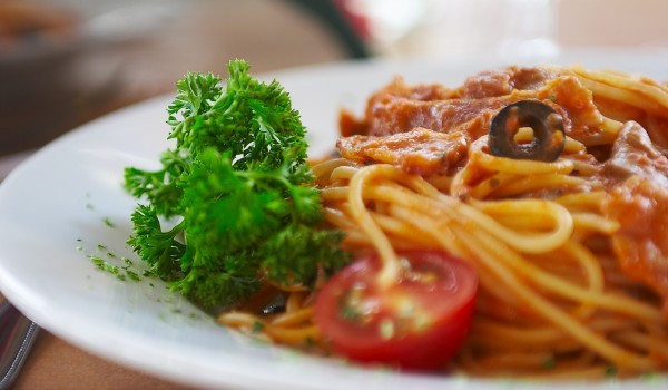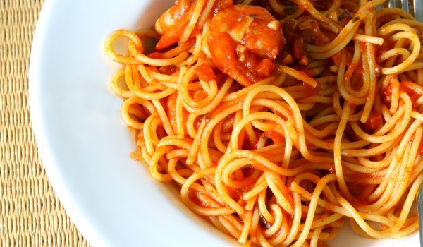 Спагетите се сваряват в подсолена вода и се отцеждат в дълбока купа. Объркват се още топли с краве масло. Доматите се измиват, почистват и настъргват на ренде. В тиган загряват 2 с.л. зехтин и се доб...