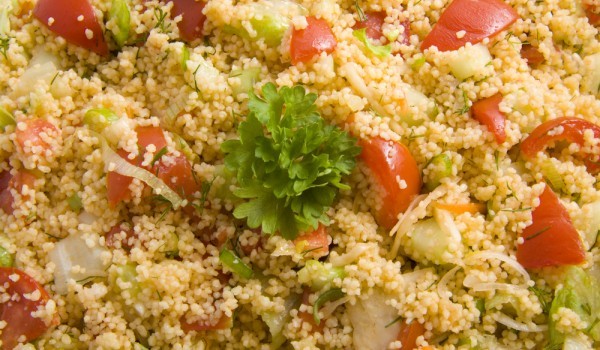 Сложете доматите в зехтина и сложете да заври сосът. Щом кипне добавете кускуса и оставете да къкри, докато се свари. Овкусете със сол и черен пипер. Прехвърлете в чинии и разпределете от нарязаните...
