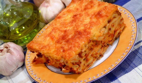 Запържват се лукът и чушката, добавят се чесънът и каймата и се пържи. Прибавят се настърганите домати и виното и се оставя да поври. Прибавят се подправките. В тавичка се редят пластове сварени мака...