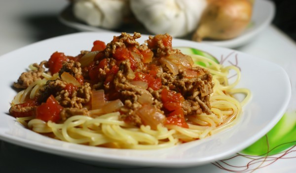 Сипете 2 л вода в голяма тенджера. Добавете сол и олио. Когато водата заври, сложете спагетите. Варете ги толкова, колкото пише на опаковката им. Когато спагетите са готови, ги изцедете. На доматения...