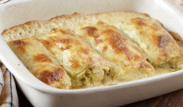 Разбийте яйцата заедно с натрошеното сирене, настърганото синьо сирене и пармезан, нарязаните на ситно копър и магданоз, сол, черен пипер. С така получената смес напълнете предварително омекналите кан...
