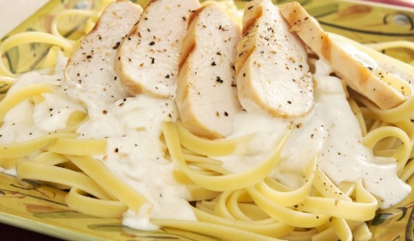 Сварете спагетите според указанията на опаковката. Междувременно, разбийте белтъка в голяма купа, прибавете пилешкото почистени от кожата и костите и нарязано на 1 см. , разбъркайте добре, за да м...
