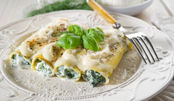 За да приготвите плънката за канелоните, разтопете маслото в тиган и задушете спанака за 2-3 минути. Бъркайте, докато се изпари цялата течност. Отнемете от котлона и прибавете изварата, пармезана, си...