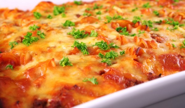 Сварете макароните в подсолена вода и ги отцедете. Изсипете ги в леко подмазнена тава. Загрейте олио в съд на котлона и задушете накълцания лук. Щом омекне прибавете към него постепенно предварително...