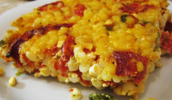 Кус кусът се сварява според указанията на опаковката, отцежда се и се прехвърля в тава. Чушките се нарязват на малки парчета и се прибавят към кус куса. Слагат се също натрошеното сирене, нарязаните н...