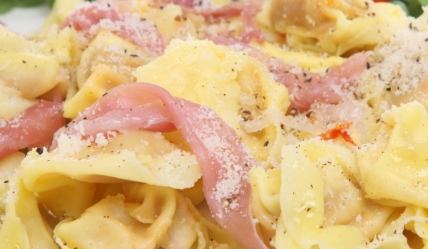 Сварете тортелините според указанията на опаковката и ги отцедете, като ги изплакнете първо със студена вода. Загрейте 2 с.л. зехтин в тиган и запържете ситно нарязания бекон и чесън, а след него и ш...