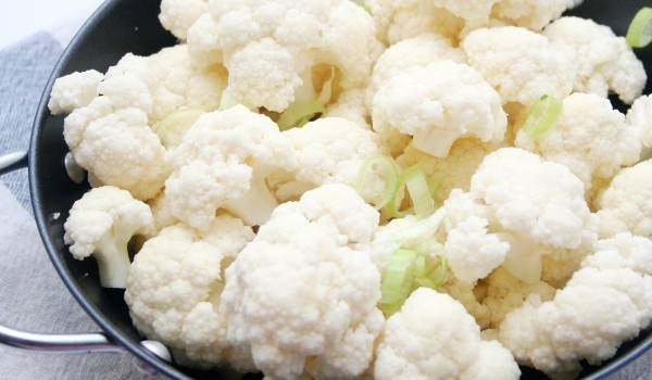 Напълнете тенджера с около 2 л подсолена вода и я кипнете. Добавете и карфиола, който предварително сте разделили на розички. Изчакайте водата да кипне, захлупете и задушавайте около 2-3 минути без да...