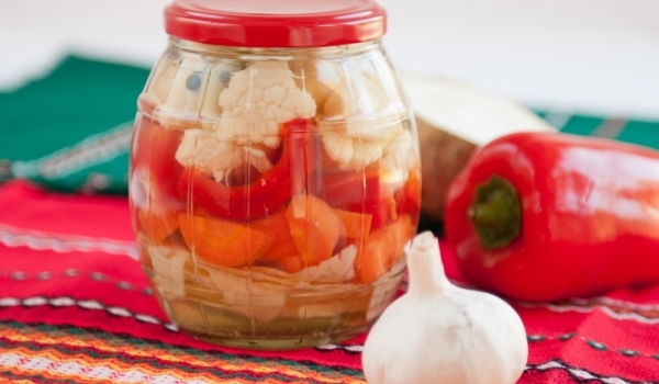 Кипнете съставките за маринатата и вътре сипете предварително приготвените зеленчуци - камбите трябва да са почистени от дръжки и семки, гроздето - оронено, карфиолът трябва да е накъсан на розички....