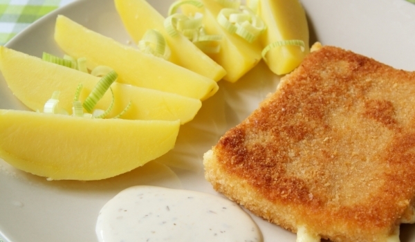 Сварете картофите до омекване, но без да ги разварявате прекалено. Обелете и ги нарежете на колелца, след което ги наредете в тава за печене. След всеки ред картофи се разстила настърган кашкавал, к...
