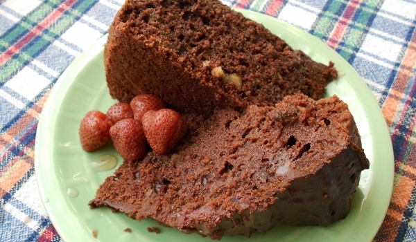 Разбийте яйцата със захарта. Добавете олиото, разтворената сода в киселото мляко, брашното, какаото и накрая орехите и канелата. Сипете кексовата смес в тава с хартия за печене. Сложете го да се изпе...