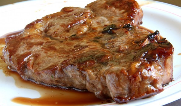 Пригответе марината от виното, оцета, захарта и кърито. Натрийте пържолите с чесън и ги овкусете със сол и черен пипер. Оставете ги в маринатата за 2 часа в покрит съд в хладилника. Подредете ги в на...