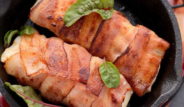 Рибата се изчиства, отрязват се главите и опашките. Реже се на парчета, като се махат костите. Беконът се реже на тънко. Лимонът се изцежда. Парчетата риба се поливат с лимонов сок, поръсват се със со...