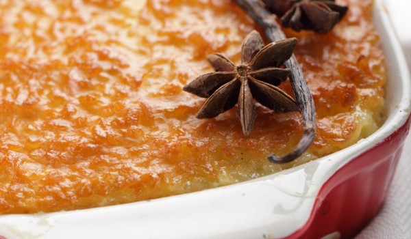 Загрейте млякото в съд на котлона, като добавите пръчката канела и остърганата шушулка ванилия + самата шушулка. Щом се загрее, разтворете в него 150 г захар. Добавете ориза и оставете да ври на тих о...