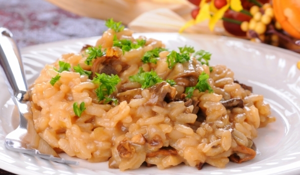 Оризът се сварява в подсолена вода. Лукът се задушава със зехтин в захлупена тенджера на слаб огън 20 минути. Прибавят се нарязаните гъби и се задушават още 5 минути. Подсолява се, наръсва се с щипка...