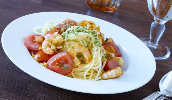 Сварете спагетите според указанията на опаковката, след което ги изплакнете под студена вода и отцедете. Загрейте зехтина в голям тиган и запържете почистените скариди. Щом поомекнат добавете скълца...