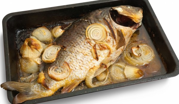 Почистете шарана, измийте го, осолете го хубаво и го накиснете в оцета за 30 минути. Задушете накълцания ситно лука с моркова, добавете почистените и нарязани гъби, долейте 1/2 от виното и малко води...