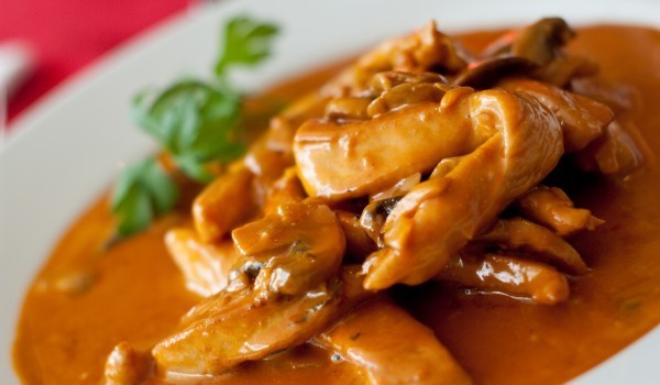 Нарежете пилешкото на малки продълговати филенца. Загрейте около 60 мл зехтин и сложете да се запържат. Долейте след това виното и щом поизври, разбъркайте енергично с брашното. Двете сметани разбий...