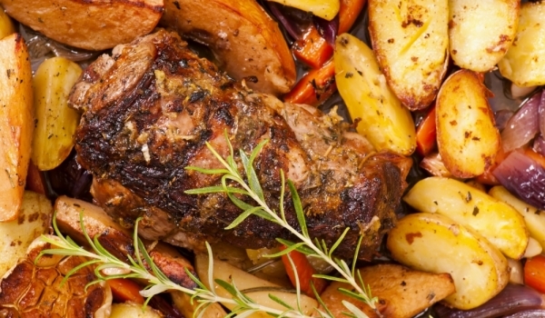 Агнешкото направете на голям лист с помощта на нож и го намажете със смес от 1 ч.л. червен пипер, черен пипер, сол, розмарин и с 1-2 с.л. вино, олио, горчицата, докато се получи гъста паста. Завийте...