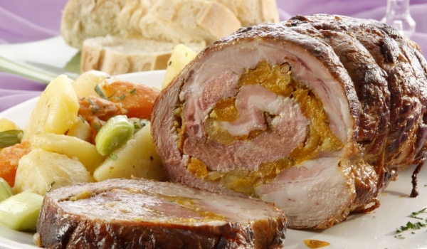 На филето се прави разрез с остър нож в средата и в него се слагат сушените кайсии предварително накиснати най малко за 20 мин. в бяло вино. Ако има кожа или мазнина на гърба, се нарязва на ромбчета....