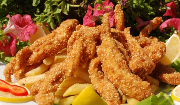 Нарежете пилешкото филе на хапки и го овкусете с горчицата и соевия сос. Покрийте съда и го поставете в хладилник за 1 час. След това всяко пилешко филенце овалвайте в брашно, разбити яйца, сусам и г...
