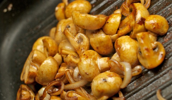Смесете в дълбока купа виното, зехтина и соевия сос и накиснете за половин час гъбите в тази марината. Накълцайте лука и го прибавете към маринатата. Загрейте оребрен тиган и изсипете гъбите и лука да...