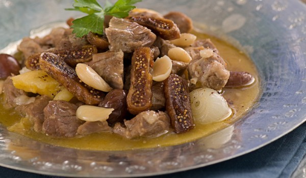 Нарежете свинското на късове. Разполовете малките лукчета и скилидките чесън. Ако използвате големи глави лук, ги нарежете на едри полумесеци. Захаросаните смокини нарежете на парчета. Може да използв...