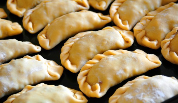 Първо пригответе от брашното и водата гладко по - твърдо тесто. Омесете го добре и го оставете да престои около 1/2 час, покрито с кърпа. Пригответе пълнежа, като смесите каймата с добре нарязания лу...