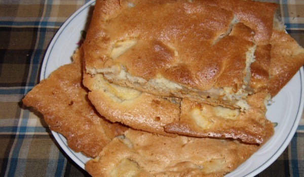 Първо приготвяме заливката, като разбиваме добре яйцата със захарта, след което прибавяме брашното, бакпулвера и ванилиите. Сместа трябва да е малко по-гъста от тази на палачинките. В правоъгълна тава...