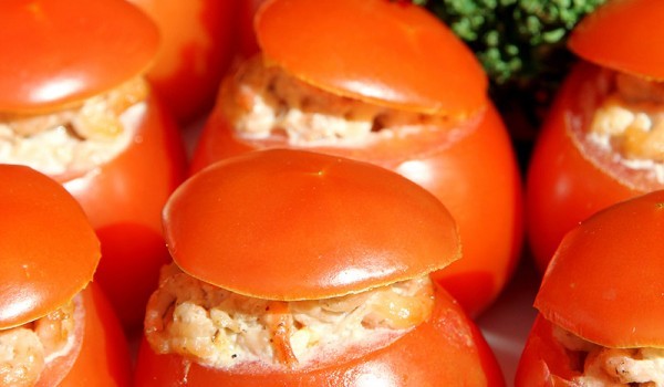Доматите се измиват и се срязват в горната част. Капачетата се запазват, а вътрешността се издълбава. Доматите се посоляват отвътре и се обръщат да се отцедят. Приготвя се плънка от нарязаните на сит...