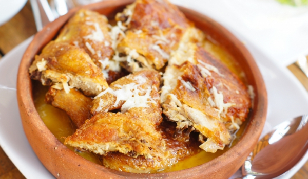 Пилето се разрязва по линията на гръдната кост и се сплесква. Натърква се със сол и черен пипер, слага се в тава и се полива с разтопеното масло. Пече се 30 минути на 200 градуса. Чесънът се нарязва...
