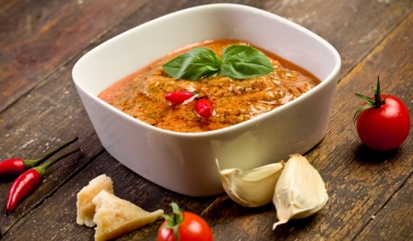 Слагате олиото в голям съд на котлона да се загрее. Нарязвате лука на едри кубчета и го слагате да се запържи в отделно загряна с малко олио тиган заедно с босилека. След като се запържи сваляте лука...