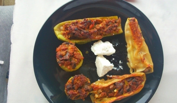 Тиквичните се издълбават, като пънчета или като лодки. Бланшират се във вряща подсолена вода за 2-3 минути. Канелоните също се бланшират в същата вода за 2-3 минути. Редят се в тавичка, намазана с оли...