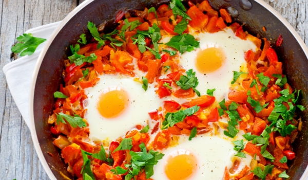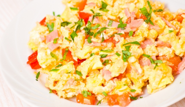 Яйцата се разбиват с прясното мляко в подходящ съд. Към тях се добавят ситно нарязаните шунка и домати, овкусява се със соли черен пипер. Сместа се готви 2-2 1/2 минути на максимална мощност, като на...